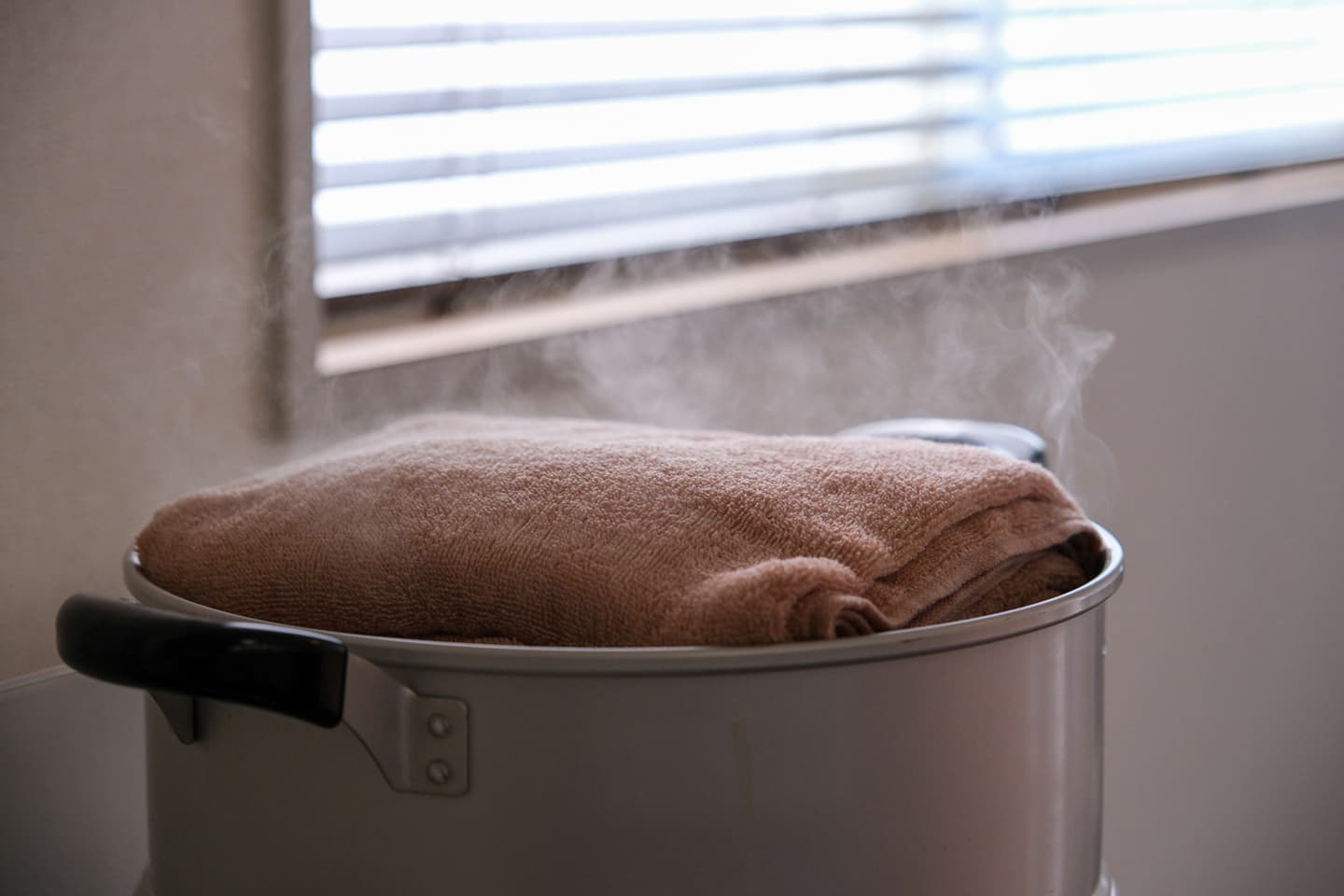 施術方法は、海水で蒸したタオルを使って、足のつま先から頭のてっぺんまで全身を温めます。
